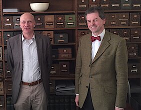 Dr. Eckart Marchand, Wissenschaftlicher Mitarbeiter des Forschungsverbunds im Warburg Archiv, erläuterte, unter anderem, die Funktion der legendären "Zettelkästen" Warburgs, vor deren Hintergrund auch ein Foto entstand.