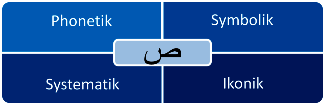 Angesichts dieser herausgehobenen Rolle, die den Buchstaben in der islamischen Kulturgeschichte zugeschrieben wurde, will das Projekt untersuchen, inwieweit die verschiedenen Buchstabenfunktionen bereits in der arabischen Gelehrtenliteratur systematisch erfasst wurden und ob die Überlegungen dazu mit moderner buchstabenwissenschaftlicher Forschung vergleichbar sind. Um dabei keine Buchstabenfunktion zu übersehen, wurde ein Schema entwickelt, das phonetische, symbolische, systematische und ikonische Dimensionen der Buchstaben berücksichtigt. Als Beispiel sei hier der arabische Buchstabe ṣād/ص gennant, der in der Mitte des Schemas zu sehen ist. Dieser Buchstabe verschriftlicht den Laut eines emphatischen, also nachdrücklich gesprochenen „s“ (Phonetik). Im arabischen Alphabet nimmt er die 14. Stelle ein, im alphanumerischen System steht er für den Zahlenwert 60 oder 90 (Systematik). Er gehört ebenfalls zu den genannten geheimnisvollen Buchstaben und könnte hier einen der Gottesnamen meinen, z.B. aṣ-Ṣāniʿ, „der Schöpfer“ (Symbolik). Zudem gleicht er in seiner Gestalt (ص) an ein mandelförmiges Auge und hat aufgrund dieser Ähnlichkeit vielfach arabische Dichter dazu veranlasst, auf dieses Motiv anzuspielen (Ikonik).