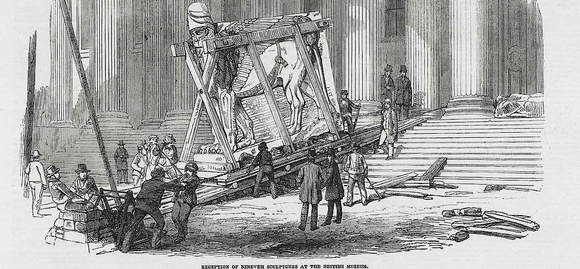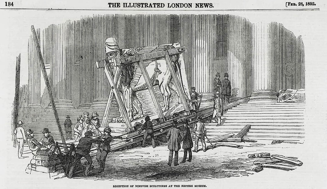 Am 28. Februar 1852 erschien in der britischen Wochenzeitung Illustrated London News eine Zeichnung. Das Bild zeigt kein Ereignis, das gerade erst stattgefunden hat. Vielmehr handelte es sich um ein visuelles Konstrukt, welches eine Begebenheit, die bereits zwei Jahre vorher stattgefunden hatte, retrospektiv legitimiert. Im Hintergrund ist die Fassade des Neubaus des British Museum in London zu sehen – damals war der Museumsneubau noch eine Baustelle. Eine Rampe führt die Treppe zur monumentalen ionischen Säulenordnung des Eingangs hinauf, welche den Eingang nicht nur architektonisch, sondern auch programmatisch in Szene setzt. Um die Rampe herum scharen sich Zeuginnen und Zeugen einer spektakulären Szene: die gewaltige Skulptur eines geflügelten Löwen wird über die Rampe in das Museum gezogen (siehe Abb. 1). Die Blickrichtung der Skulptur ist nach außen gerichtet, als würde sie einen letzten Blick ins Freie wagen, bevor sie eine neue kanonische Ordnung im Inneren des Museums betritt.