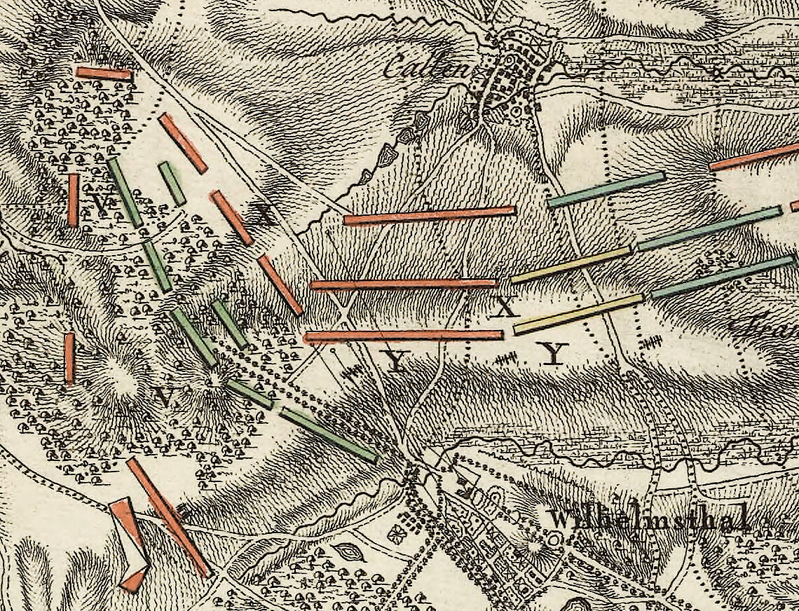 Bild 1: Der Ort der intensivsten Kämpfe und der meisten Gefangenen: In einem Waldstück oberhalb des Jagdschlosses Wilhelmsthal wurden französische Einheiten (grün) von Hannoveranern und Briten (rot), Braunschweigern (gelb) und Hessen (blau) abgeschnitten und ergaben sich nach einem Infanteriekampf zu Kriegsgefangenen. Friedrich Wilhelm Bauer/Jacob van der Schley: Plan der Schlacht von Wilhelmsthal 1762 (Detailansicht), Kupferstich, 1763, Source gallica.bnf.fr / BnF, Permalink: https://gallica.bnf.fr/ark:/12148/btv1b53202568d.