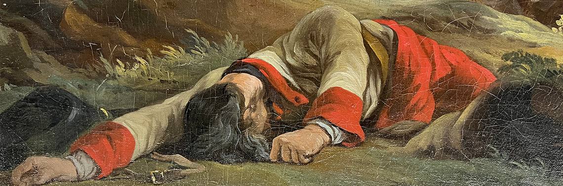 Bildnachweis Header: Detail aus einem Ölgemälde, das einen toten oder schwerverwundeten französischen Soldaten zeigt. Jean-Baptiste Le Paon (zugeschrieben): Episode aus dem Siebenjährigen Krieg (Detail), Öl auf Leinwand, um 1769, Musée Condé, Chantilly. Foto: Leonard Dorn, CC BY-SA 4.0.