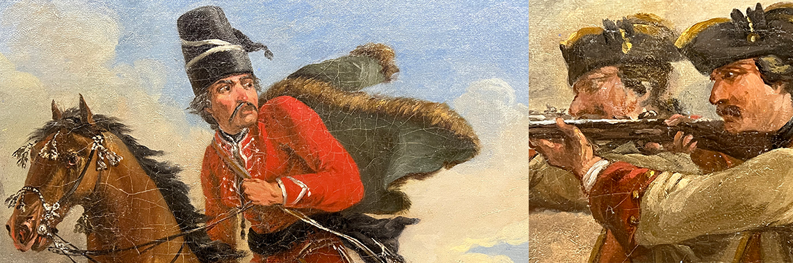Bild 2: Details aus einem Ölgemälde: ein Husar flieht vor anlegenden französischen Infanteristen. Jean-Baptiste Le Paon (zugeschrieben): Episode aus dem Siebenjährigen Krieg (Detail), um 1769, Musée Condé, Chantilly. Foto und Collage: Leonard Dorn, CC BY-SA 4.0.